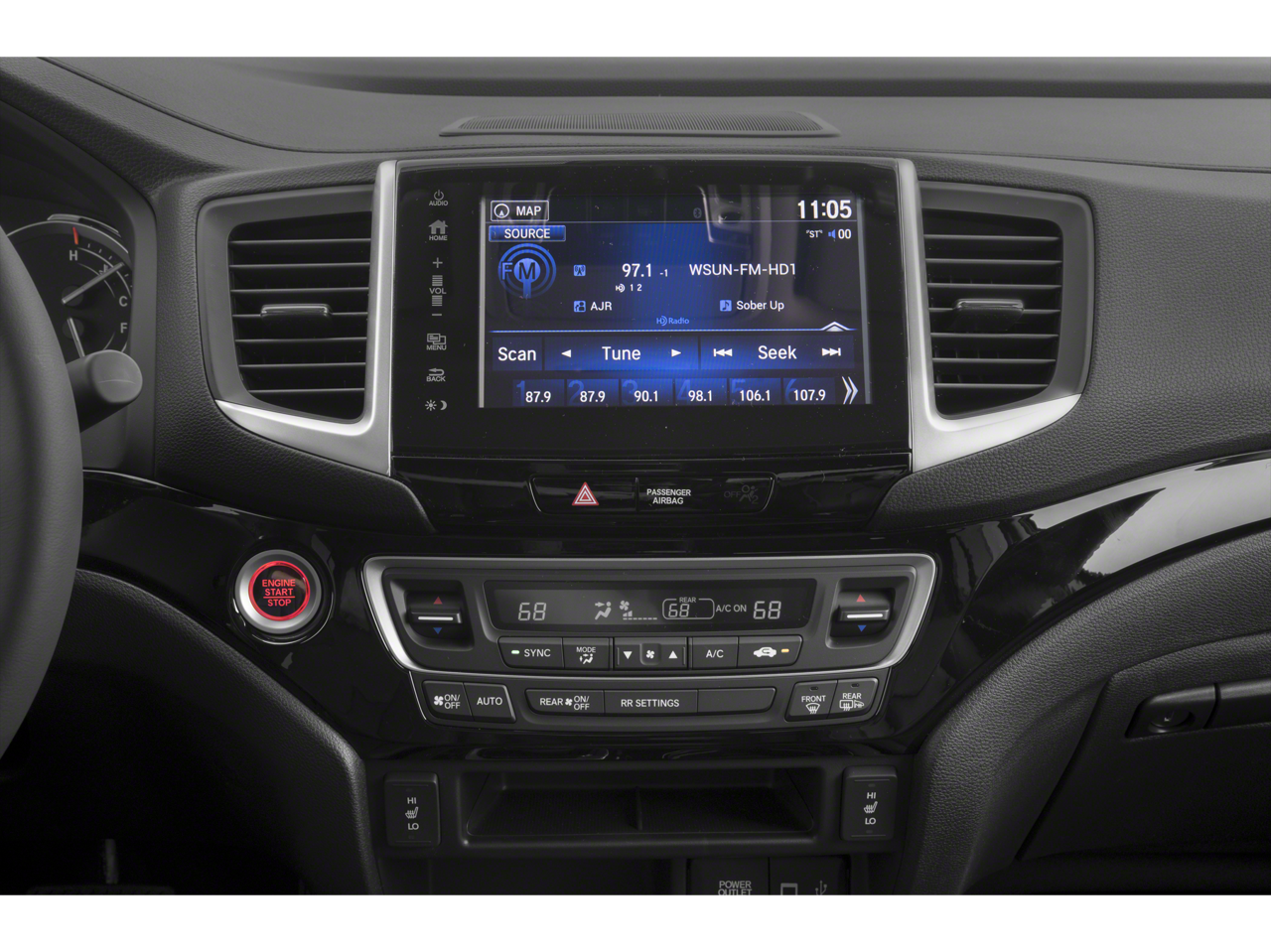 This vehicle Contains the following features and options: 4-Wheel Disc Brakes, 4.25 Axle Ratio, 8 Speakers, ABS brakes, Air Conditioning, Alloy wheels, AM/FM radio: SiriusXM, Apple CarPlay/Android Auto, Auto High-beam Headlights, Auto-dimming Rear-View mirror, Automatic temperature control, Blind Spot Information (BSI) System warning, Bluetooth® Hands-Free Link, Brake assist, Bumpers: body-color, Compass, Delay-off headlights, Driver door bin, Driver vanity mirror, Driver's Seat Mounted Armrest, Dual front impact airbags, Dual front side impact airbags, Electronic Stability Control, Exterior Parking Camera Rear, Forward collision: Collision Mitigation Braking System (CMBS) + FCW mitigation, Four wheel independent suspension, Front anti-roll bar, Front Bucket Seats, Front dual zone A/C, Front fog lights, Front reading lights, Fully automatic headlights, Garage door transmitter: HomeLink, Heated door mirrors, Heated Front Bucket Seats, Heated front seats, Heated steering wheel, Honda Satellite-Linked Navigation System, Illuminated entry, Lane departure: Lane Keeping Assist System (LKAS) active, Leather Seat Trim, Low tire pressure warning, Memory seat, Navigation system: Honda Satellite-Linked Navigation System, Occupant sensing airbag, Outside temperature display, Overhead airbag, Overhead console, Panic alarm, Passenger door bin, Passenger seat mounted armrest, Passenger vanity mirror, Power door mirrors, Power driver seat, Power moonroof, Power passenger seat, Power steering, Power windows, Radio data system, Radio: AM/FM/MP3 w/Nav System & Truck-Bed Audio, Rear air conditioning, Rear anti-roll bar, Rear reading lights, Rear seat center armrest, Rear step bumper, Rear window defroster, Remote keyless entry, Security system, SiriusXM Radio, Speed control, Speed-sensing steering, Split folding rear seat, Steering wheel mounted audio controls, Tachometer, Telescoping steering wheel, Tilt steering wheel, Traction control, Trip computer, Variably intermittent wipers, and Wheels: 18 Exclusive Machine-Finished Alloy.