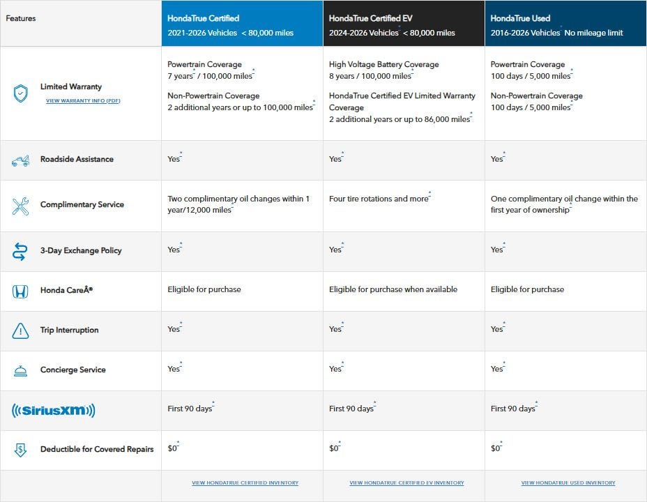 * Honda Care Roadside Assitance for 1 year/12,000 miles whichever comes first). Trip Interruption and Concierge Service for 1 year/12,000 miles (whichever occurs first) beginning at the expiration of the New Vehicle Limited Warranty, or from the date of sale of the vehicle if the New Vehicle Limited Warranty has expired at the time of sale. 2015 and newer models, Honda Roadside Assistance is available throughout the New Vehicle Limited Warranty period. One complimentary oil change within the first year of ownership. SiriusXM 90-Day free trial.