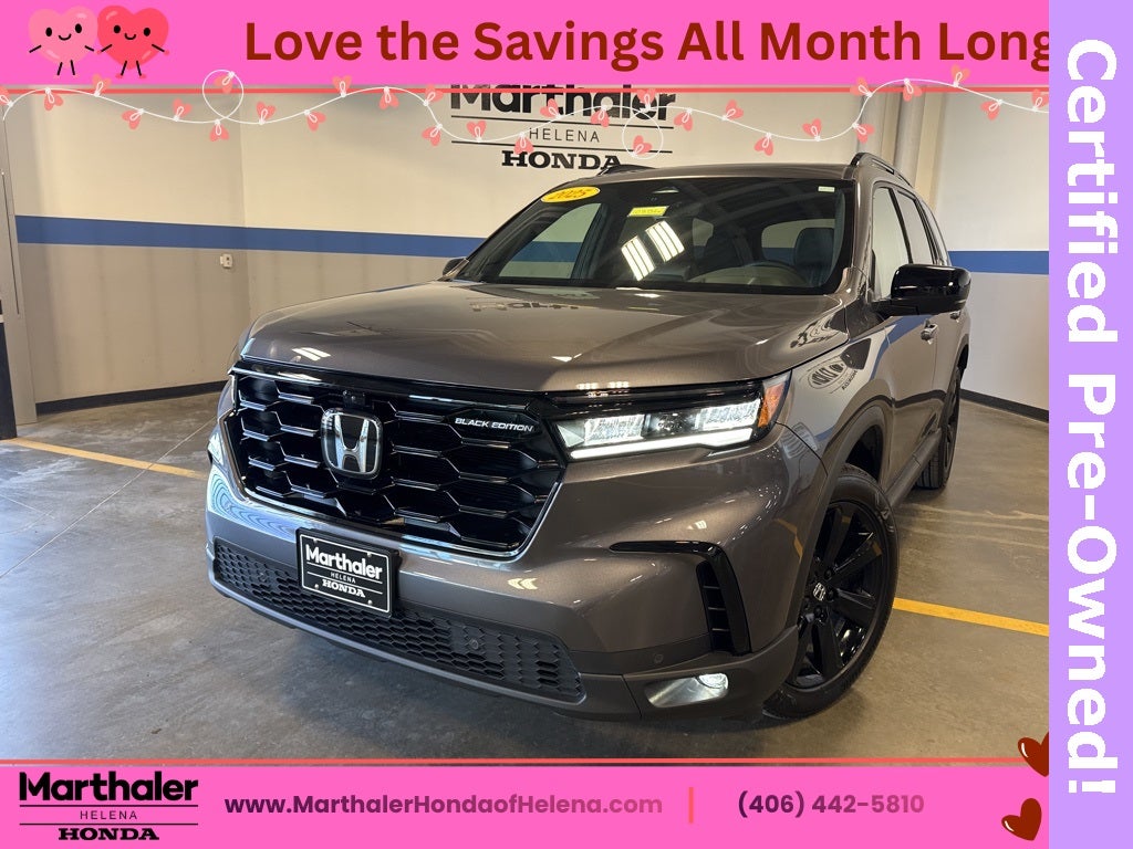 2025 Honda Black Edition Pilot ** REAR CAMERA **, ** FORWARD COLLISION WARNING **, ** CLEAN VEHICLE HISTORY REPORT **, ** BLIND SPOT ALERT **, ** ALL WHEEL DRIVE **, ** ADAPTIVE CRUISE **, ** BLUE TOOTH **, ** REMOTE START **, ** HEATED SEATS **, ** HEATED STEERING WHEEL **, ** APPLE CAR PLAY **, ** ANDROID AUTO **, ** CERTIFIED PRE-OWNED **, ** PANORAMA MOONROOF **, ** RETIRED SERVICE LOANER **.